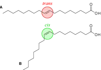 Une configuration trans signifie que les atomes de carbone adjacents à la double liaison sont situés de part et d'autre de cette dernière. La chaîne hydrocarbonée adopte une configuration rectiligne très semblable à celle de l'acide gras saturé correspondant. La plupart des acides gras trans ne sont pas synthétisés naturellement par les organismes vivants et sont produits industriellement par des procédés tels que l'hydrogénation partielle, par exemple dans les procédés de l'industrie agroalimentaire destinés à donner une meilleure tenue aux aliments (viennoiseries plus « croustillantes ») et une plus grande résistance au rancissement (à la peroxydation des lipides en particulier), les acides gras insaturés étant particulièrement sensibles à cet égard.