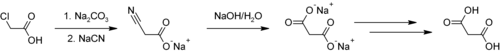 le carbonate de sodium génère le sel de sodium de l'acide qui alors réagit avec le cyanure de sodium pour former l'acide cyanoacétique via une substitution nucléophile. Le groupe nitrile est hydrolysé avec de l'hydroxyde de sodium en malonate de sodium dont l'acidification fournit l'acide malonique.