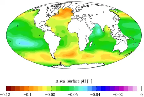 Sur la base des prévisions du GIEC (ou IPCC en anglais), l'augmentation actuelle du taux de CO2 dans l’atmosphère devrait encore diminuer le pH des eaux du globe de 8,14 actuellement à 7,8 d'ici la fin du siècle[38]. Un rapport du PNUE fait part d'une diminution du pH de 0,3 d'ici 2100, tandis qu'un communiqué de presse du CNRS avance une baisse de 0,4[39],[40].