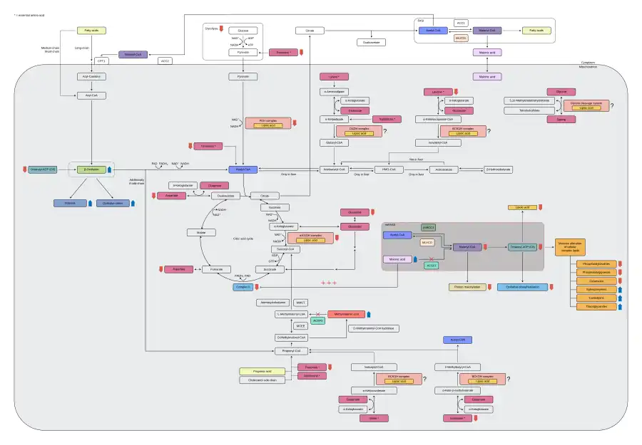 Le déficit d'ACSF3 dans la CMAMMA entraîne une accumulation d'acide malonique et un déficit mitochondrial en malonyl-CoA[12]. Alors que l'acide malonique inhibe de manière compétitive le complexe II et a un effet cytotoxique, le déficit du substrat malonyl-CoA entraîne à son tour une malonylation réduite des protéines mitochondriales, ce qui affecte l'activité des enzymes métaboliques et modifie le métabolisme cellulaire[12]. Cependant, la demande en malonyl-CoA peut encore être satisfaite en partie par l'enzyme mtACC1, une isoforme mitochondriale de l'ACC1, ce qui explique le large phénotype clinique de la CMAMMA[13]. Les carences en intermédiaires peuvent être poursuivies jusqu'au principal produit de mtFASII, l'octanoyl-ACP, qui est nécessaire comme substrat de départ pour la biosynthèse de l'acide lipoïque, pour l'assemblage des complexes de phosphorylation oxydative et comme substrat endogène pour la β-oxydation[3]. Des complexes multi-enzymatiques mitochondriaux importants tels que ceux du métabolisme énergétique, le complexe pyruvate déshydrogénase (PDHC), le complexe α-cétoglutarate déshydrogénase (α-KGDHC) et du métabolisme des acides aminés, le complexe de l'alpha-cétoacide déshydrogénase à chaîne ramifiée (BCKDHC), le complexe de l'oxoadipate déshydrogénase (OADHC) et le système de clivage de la glycine (GCS), dépendent de l'acide lipoïque en tant que cofacteur covalent pour leur fonctionnalité[14],[15]. Par conséquent, la lipoylation réduite du complexe pyruvate déshydrogénase et du complexe α-cétoglutarate déshydrogénase entraîne une réduction du flux glycolytique, mesuré dans la glycolyse et la capacité glycolytique[3]. Pour compenser probablement la demande énergétique de la cellule, une augmentation de la β-oxydation des acides gras et une diminution de la concentration des acides aminés qui alimentent anaplérotiquement le cycle de Kebs, tels que l'aspartate, la glutamine, l'isoleucine, la thréonine et la leucine, ont pu être détectées[3]. En résumé, la réduction de la respiration mitochondriale et du flux glycolytique entraîne une altération de la flexibilité mitochondriale avec une forte dépendance à la β-oxydation des acides gras et une consommation accrue d'acides aminés anaplérotiques[3],[13].