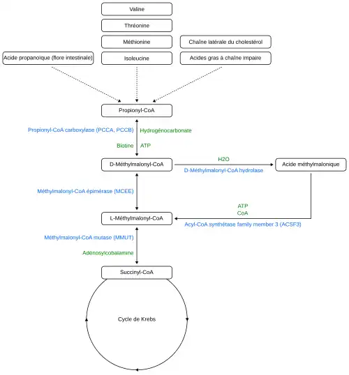 La fermentation bactérienne dans l'intestin est une source quantitativement importante d'acide propanoïque, qui est un précurseur de l'acide méthylmalonique[16],[17]. En outre, l'acide propanoïque est également absorbé par l'alimentation, car il est naturellement présent dans certains aliments ou est ajouté comme conservateur par l'industrie alimentaire, en particulier dans les produits de boulangerie[18] et les produits laitiers[19]. En outre, l'acide méthylmalonique est formé lors du catabolisme de la thymine[16],[17].