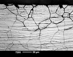 - la corrosion sous contrainte provoque la mise hors service très rapide des objets qu'elle attaque. Elle est heureusement très rare. Pour qu'elle se produise, il faut que les pièces comportent des parties mises en tension, même faiblement, sous l'effet des contraintes de service ou des effets secondaires des soudures, de l'emboutissage… et qu'elles soient en outre exposées à un milieu corrosif de type eau impure, solutions de chlorures même très diluées, soude caustique chaude.