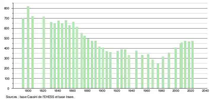 L'évolution du nombre d'habitants est connue à travers les recensements de la population effectués dans la commune depuis 1793. Pour les communes de moins de 10 000 habitants, une enquête de recensement portant sur toute la population est réalisée tous les cinq ans, les populations de référence des années intermédiaires étant quant à elles estimées par interpolation ou extrapolation[33]. Pour la commune, le premier recensement exhaustif entrant dans le cadre du nouveau dispositif a été réalisé en 2007[34].