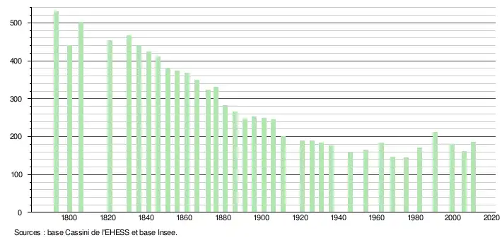 - ↑ Dans le tableau des recensements et le graphique, par convention dans Wikipédia, le principe a été retenu, pour les populations légales postérieures à 1999 de n’afficher dans le tableau des recensements et le graphique que les populations correspondant à l'année 2006, première population légale publiée calculée conformément aux concepts définis dans le décret no 2003-485 du 5 juin 2003, et les années correspondant à une enquête exhaustive de recensement pour les communes de moins de 10 000 habitants, ainsi que la dernière population légale publiée par l’Insee.