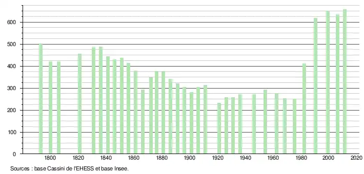 L'évolution du nombre d'habitants est connue à travers les recensements de la population effectués dans la commune depuis 1793. À partir du , les populations légales des communes sont publiées annuellement dans le cadre d'un recensement qui repose désormais sur une collecte d'information annuelle, concernant successivement tous les territoires communaux au cours d'une période de cinq ans. Pour les communes de moins de 10 000 habitants, une enquête de recensement portant sur toute la population est réalisée tous les cinq ans, les populations légales des années intermédiaires étant quant à elles estimées par interpolation ou extrapolation[11]. Pour la commune, le premier recensement exhaustif entrant dans le cadre du nouveau dispositif a été réalisé en 2007[12],[Note 2].