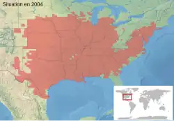 - aux États-Unis dans l'est des Rocheuses au Nouveau-Mexique, au Colorado, au Texas, au Oklahoma, au Nebraska, au Dakota du Sud, au Minnesota, au Wisconsin, en Iowa, au Missouri, en Arkansas, en Louisiane, au Mississippi, en Alabama, au Tennessee, au Kentucky, au Illinois, au Indiana, au Michigan, en Ohio, en Pennsylvanie, au Delaware, au Maryland, au New Jersey et dans l'État de New York, en Virginie, en Virginie-Occidentale, en Caroline du Nord, en Caroline du Sud, en Géorgie, en Floride ;