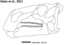 Il possède d'autres caractères spécifiques, comme une arcade post-orbitaire élargie, une base du crâne fermement attachée derrière le trou occipital, une jonction élargie entre les pattes de l'animal et les os frontaux et préfrontaux. La partie haute de la pommette forme une cavité.