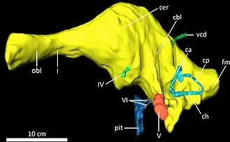 - 1 2 (en) Jonathan Franzosa et Timothy Rowe, « Cranial endocast of the Cretaceous theropod dinosaur Acrocanthosaurus atokensis », Journal of Vertebrate Paleontology, vol. 25, no 4, , p. 859-864 (DOI 10.1671/0272-4634(2005)025[0859:CEOTCT]2.0.CO;2, S2CID 10173542, lire en ligne [PDF]).