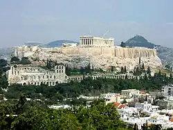 L'acropole d'Athènes se situe sur une colline de 156 m de hauteur dans la capitale grecque. Plusieurs monuments datant du Ve siècle av. J.-C. se trouvent au sommet tels que le Parthénon, le temple d'Athéna Niké et l'Érechthéion. Ces derniers étaient destinés à certains dieux de la mythologie grecque. Ces chefs-d’œuvre architecturaux ont survécu aux guerres et aux catastrophes naturelles[2].