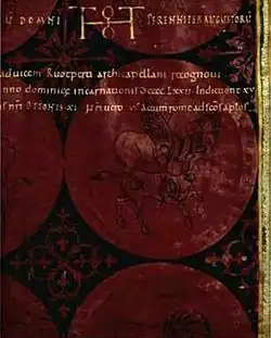 Le document long de 144,5 cm et large de 39,5 cm est un volumen consistant en trois morceaux de parchemin collés ensemble et roulés[13]. On suppose qu'il a été fabriqué dans l'abbaye impériale de Fulda[14], Hartmut Hoffmann attribue la peinture au Maître du Registrum Gregorii[15]. Une étude scientifique du parchemin pourpre à Munich a montré en 1966 que du minium et de la garance ont été utilisés pour la coloration, une indication que la matière a été confectionnée en Occident plutôt que dans l'Empire byzantin[14]. Ce document est un des rares témoins de l'utilisation de la garance au haut Moyen Âge[16],[17]. Le fond pourpre est travaillé à la manière des coûteuses étoffes de soie byzantines : 14 médaillons circulaires et deux demi-médaillons tapissent le champ d'écriture. Les surfaces hors des médaillons sont indigo, avec des motifs végétaux et ornementaux. Les médaillons contiennent des représentations d'animaux : à chaque fois, deux paires d'animaux se battant sont présentées l'une à côté de l'autre en sens opposé. Alternativement, des sortes de griffons saisissant une biche et des lions abattant des chevaux ou des bœufs sont représentés. Les motifs sont inspirés par un mélange d'art du Proche-Orient et byzantin[18].