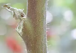 Sur la tomate, les trichomes glandulaires des feuilles et des tiges protègent les parties vitales de la plante contre de nombreux insectes phytophages comme les tétranyques à deux points, mais ils peuvent également gêner les acariens prédateurs et d'autres ennemis naturels. La petitesse d'Aculops lycopersici lui permet de se réfugier et se nourrir entre ces poils. Il utilise ses stylets d'environ 10 μm de long pour se nourrir des cellules épidermiques des feuilles, mais plus encore des pétioles et des tiges de la tomate. Ainsi protégé et en l'absence de mesures de lutte, cet acarien Eriophyidae devient un ravageur où il provoque l'acariose bronzée de la tomate[3].
