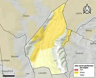 Avec le changement climatique, ces variables ont évolué. Une étude réalisée en 2014 par la Direction générale de l'Énergie et du Climat[13] complétée par des études régionales[14] prévoit en effet que la température moyenne devrait croître et la pluviométrie moyenne baisser, avec toutefois de fortes variations régionales. Ces changements peuvent être constatés sur la station météorologique de Météo-France la plus proche, « Lourdes », sur la commune de Lourdes, mise en service en 1881[15] et qui se trouve à 5 km à vol d'oiseau[16],[Note 4], où la température moyenne annuelle est de 13,3 °C et la hauteur de précipitations de 1 426,7 mm pour la période 1981-2010[17]. Sur la station météorologique historique la plus proche, « Tarbes-Lourdes-Pyrénées », sur la commune d'Ossun, mise en service en 1946 et à 6 km[18], la température moyenne annuelle évolue de 12,2 °C pour la période 1971-2000[19], à 12,6 °C pour 1981-2010[20], puis à 12,9 °C pour 1991-2020[21].