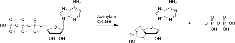 Dans les êtres vivants, elle est produite à partir d'ATP (figure 1) par l'enzyme adénylate cyclase (ou adényl cyclase) et peut être dégradé par une phosphodiestérase. L'adénylate cyclase est généralement activée ou réprimée en réponse à l'activation par un ligand (hormone, neurotransmetteur) d'un récepteur à sept domaines transmembranaires couplé à une protéine G. Si la protéine G possède une sous-unité , l'adénylate cyclase est activée, si la protéine G possède une sous-unité , l'adénylate cyclase est réprimée.