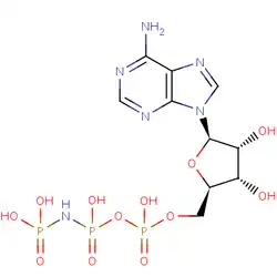 L'adénylyl-imidodiphosphate (AMP-PNP) est un analogue structurel non hydrolysable de l'ATP[2]. Il est utilisé depuis les années 1970 notamment pour étudier les interactions entre l'ATP et les enzymes qui hydrolysent cette molécule (kinases)[3], dont il est un inhibiteur enzymatique[4],[5],[6].
