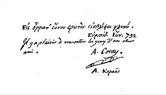 - ↑ Biographie de Koraïs par l'Université nationale et capodistrienne d'Athènes (en grec). Voir aussi Coray 1877, p. XXII.
