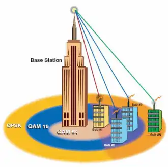 Un exemple d'utilisation de la méthode AMC est illustré dans la figure ci-contre, montrant le cas d’une augmentation de la portée lorsque le système distant s'éloigne, par utilisation d'une constellation d'ordre inférieur. Inversement, au plus près de la station de base, des constellations d'ordre supérieur peuvent être employées pour une efficacité accrue.
