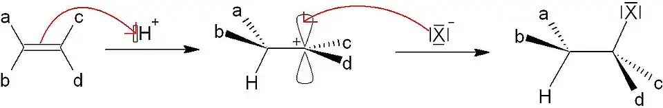 L'ajout d'un acide halogénohydrique (chlorhydrique, bromhydrique ou iodhydrique) sur un alcène conduit à la formation d'un composé halogéné. On appelle ce type de réaction hydrohalogénation. L'électrophile H+ réagit sur les électrons π pour conduire à un carbocation intermédiaire. L'ion halogénure restant vient alors attaquer le carbone déficitaire pour finalement former la molécule halogénée. On constate donc que l'addition électrophile est nécessairement suivie d'une addition nucléophile pour stabiliser le carbocation.