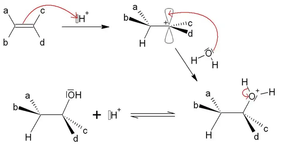 Selon un procédé identique, on peut hydrater un alcène pour former un alcool. On a besoin d'être en milieu acide pour activer la réaction (formation du carbocation). La forme oxonium R-O+H2 est en équilibre avec l'alcool sur le papier mais comme on est en présence d'une catalyse homogène acide, l'ion H+ formé réagit avec l'alcène de départ et donc déplace l'équilibre vers la formation de l'alcool.