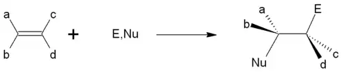 Une addition consiste donc à l'appropriation des électrons π par un électrophile qui formera une liaison σ avec l'un des carbones de la double liaison. Dans la majorité des cas, l'addition électrophile sera suivie de l'addition d'un nucléophile. Cette réaction conduira à un grand nombre de composés, tels que des alcools, thiols, halogénohydrines ou encore époxydes.