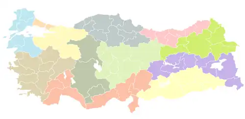 La Turquie est divisée en 7 régions géographiques (coğrafi bölge) ; elles sont sommairement constituées de provinces (mais certaines provinces peuvent avoir des petites parties dans des régions voisines) :