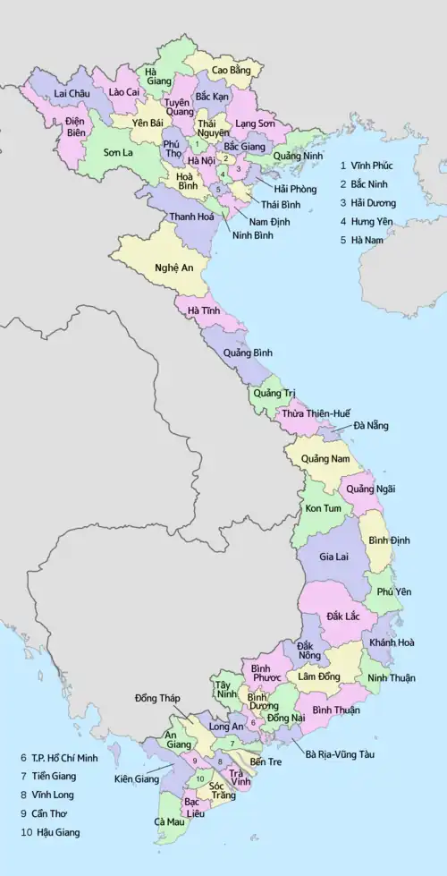 Le Viêt Nam est divisé en 58 provinces (en vietnamien : tỉnh, du mandarin 省 shěng). Il y a aussi cinq municipalités (en vietnamien : thủ đô, du mandarin 首都 shǒudū) qui ont une organisation administrative et exécutive similaire aux provinces.