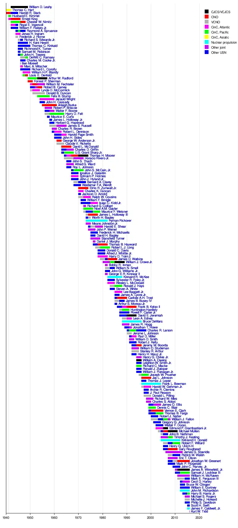 Michael S. RogersWilliam H. McRavenJames A. Winnefeld, Jr.Jonathan W. GreenertEric T. OlsonGary RougheadMichael MullenLeighton SmithWilliam A. OwensWilliam O. StudemanJames D. WatkinsThomas B. HaywardStansfield TurnerHyman RickoverBernard A. ClareyJohn S. McCain, Jr.John S. ThachHoracio Rivero Jr.James S. RussellJames L. Holloway Jr.Arleigh BurkeLynde D. McCormickArthur W. RadfordMarc A. MitscherRichmond K. TurnerThomas C. KinkaidJonas H. IngramRaymond A. SpruanceWilliam F. Halsey Jr.Chester W. NimitzErnest KingHusband E. KimmelHarold R. StarkThomas C. HartWilliam D. Leahy