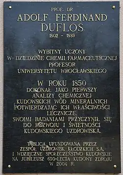 Plaque commémorative des travaux d'Adolf Ferdinand Duflos à Kudowa-Zdrój.