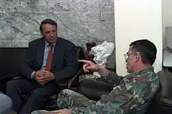 En juin 1999, il présente une nouvelle politique de défense intitulée « la sécurité par la coopération », où le rôle de l'armée n'est plus la défense militaire autonome du territoire suisse, mais consiste à faire face aux menaces diverses contre l'État et les conditions d'existence de ses habitants, la Suisse devant prendre une part active aux efforts de la communauté internationale en faveur de la paix[4]. La révision de la loi sur l'armée qui permet l'armement de militaires suisses s'inscrit dans cette perspective.