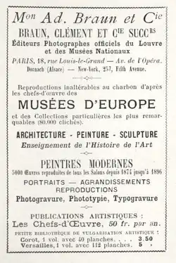 Ce fut lors d’une campagne pour la réalisation de vues pittoresques[6] que Braun en 1862 reproduit les dessins de Hans Holbein du Kunstmuseum de Bâle. L’édition du catalogue Allemagne de 1865 contient une quarantaine de reproductions d’antiques et de vues d’intérieurs des musées de Berlin et de Dresde. À l’instar des Fratelli Alinari, l’intention de Braun fut de « rassembler un inventaire visuel des diverses richesses artistiques de ces régions[7] ». Un autre projet le taraude, celui de photographier les chefs-d’œuvre du musée du Louvre. Pour mener à bien ce projet de vaste envergure, Braun n’était pas seul. Son frère Charles (1815-1892), ses fils Henri (1837-1876) et Gaston (1845-1928) l’aidèrent dans son entreprise. Comme Goupil & Cie, Braun ouvrit des succursales à travers l’Europe et aux États-Unis. Son premier atelier et sa boutique installés au 14, rue Cadet à Paris ouvrit en 1868. Ses épreuves portent alors la mention : « Ad. Braun (de Dornach)/ Photographe de S. M. l’Empereur/ Collections des Dessins des grands maîtres,/ des Musées du Louvre, Vienne, Florence,/ Weimar, Bâle, etc./ Reproduites en couleur par le procédé au charbon/ 14, rue Cadet, 14[8]. »