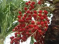 Une des particularités de ce palmier est sa fructification. Des grappes de fruits apparaissent en hiver sur les inflorescences, et arrivent à maturité en fin d'année en devenant rouge vif. Les fruits sont des drupes ovoïdes, qui donnent son aspect caractéristique décoratif à la plante. Ils ont une taille de 2 cm sur 1,5 cm. Sous la peau se trouve une couche de fibres, qui renferme une graine très dure.