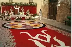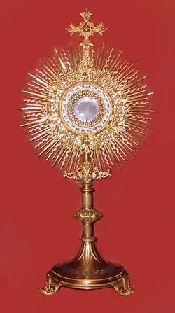 Lors de la Fête-Dieu (dont le nom officiel est « Solennité du corps et du sang du Christ »), est particulièrement commémorée l'institution du sacrement de l'Eucharistie. Dans certains pays, le Saint-Sacrement est amené en procession solennelle à travers la ville, parfois avec la participation des autorités civiles. Pendant le parcours, l'ostensoir est placé sous un dais ou un ombrellino. Pour rendre le cortège plus solennel, peuvent être prévues des bannières de procession, des tapis de fleurs le long du chemin, voire quelquefois des arcs de triomphe floraux. Le Saint-Sacrement est amené jusqu'à son reposoir où ont lieu l'office du salut et de la bénédiction.