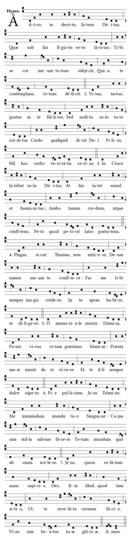 (I) Adoro te devote, latens Deitas, (II) Visus, tactus, gustus in te fallitur, (III) In cruce latebat sola Deitas, (IV) Plagas, sicut Thomas, non intueor, (V) O memoriale mortis Domini ! (VI) Pie pellicane, Jesu Domine, (VII) Jesu, quem velatum nunc aspicio, |