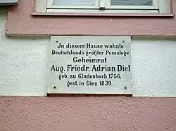 - Parmi les poires la Beurré Diel[5] rappelle le créateur de variété qu'il était (cf. Liste des variétés de poires (de)). Avec la Balduinsteiner Kinderbirne, maintenant disparue, Diel immortalisa le fait que Diez est situé près de Balduinstein.
