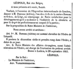 Il fut décoré chevalier de l'Ordre Léopold Ier en 1862[12] à la suite de l'exposition universelle de Londres.