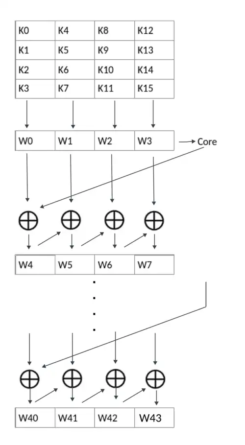 La clé initiale (128, 192 ou 256 bits) est divisée en mots, chacun contenant 4 octets :