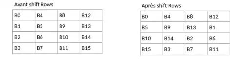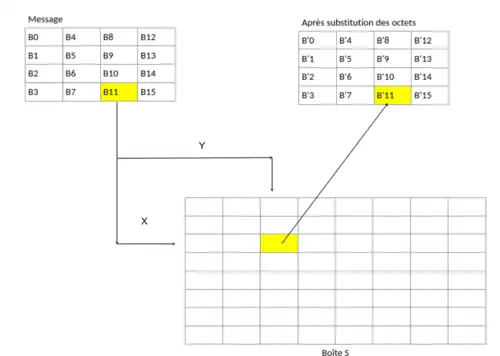 Chaque octet dans le message représenté par un bloc 4x4 sera remplacé par un autre octet en utilisant une table de substitution 16x16 (boite S)