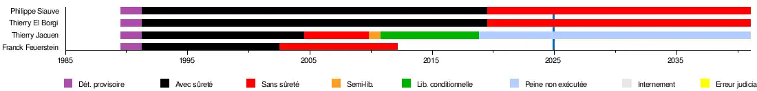 | Statut | Affaire jugée : Siauve et El Borgi condamnés à la réclusion criminelle à perpétuité assortie d'une période de sûreté de 30 ans ; Jaouen condamné à quinze ans de réclusion et bénéficie d'un régime de semi-liberté depuis octobre 2009 ; Feuerstein condamné à treize ans de réclusion criminelle |