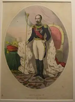 Napoléon III, Empereur des Français par Franz Xaver Winterhalter (1853, Rome, Musée napoléonien de Rome) : L'empereur est devant le palais des Tuileries, portant l’uniforme militaire de lieutenant-général ou général de division, le grand collier de la Légion d'honneur, l’écharpe de moire rouge de cet ordre, qui lui barre le tronc et, accroché sur ses épaules, le manteau de pourpre brodé d'abeilles dorées et fourré d'hermine, mais inexistant dans la réalité[11]. Il est imaginé à partir du manteau d'Isabey et Percier[12]. Napoléon III tient dans sa main droite la main de justice, tandis que sa main gauche repose sur son épée. Sa couronne[13] est semblable à celle fabriquée en 1853 par Alexandre-Gabriel Lemonnier[14] avec les pierres de celle de Charles X[15] (dont les aigles furent fabriqués par les frères Fannière). La couronne est fermée, comme celle de Louis XV, mais fut fondue en 1887[16]. Apparaît sous le manteau impérial le sceptre de Charles V, restauré en 1804. Derrière l'empereur repose le trône réalisé par Jacob-Desmalter, au dossier rond et orné de lauriers, créé pour son oncle Napoléon Ier.