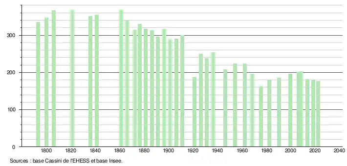 L'évolution du nombre d'habitants est connue à travers les recensements de la population effectués dans la commune depuis 1793. Pour les communes de moins de 10 000 habitants, une enquête de recensement portant sur toute la population est réalisée tous les cinq ans, les populations de référence des années intermédiaires étant quant à elles estimées par interpolation ou extrapolation[19]. Pour la commune, le premier recensement exhaustif entrant dans le cadre du nouveau dispositif a été réalisé en 2008[20].