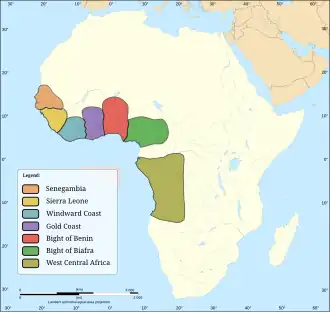 - Afrique occidentale : ports du Sénégal et de Gambie (sur une moindre échelle l’île de Gorée)[49],[50], Saint-Georges-de-la-Mine (aujourd’hui dans le port d’Elmina) au Ghana, Ouidah au Bénin, et Calabar dans l’actuel Nigeria ;