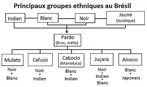 - ↑ E. E. Telles (2004), Race in Another America, p. 86. « Le gouvernement brésilien a cherché à dichotomiser, ou pire, à (nord-)américaniser la classification raciale dans une société qui utilisait, voire prônait les termes intermédiaires. »