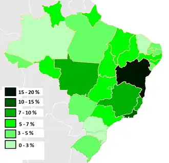 Lors du recensement de l’Institut brésilien de géographie et de statistiques (IBGE) de 2010, 7,6 % des Brésiliens identifiaient leur couleur de peau ou leur race comme noire, 43,1 % comme brune (pardo) et 47,7 % comme blanche[5]. Ces données toutefois sont à analyser avec précaution, compte tenu de la tendance historique au branqueamento que l’on observe dans les auto-classifications raciales dans ce pays[7],[8]. Pour des raisons d’ordre statistique, l’IBGE classe comme population noire les noirs et bruns tout ensemble[16], encore que cette méthodologie ait été contestée par d’aucuns, au motif que la majorité des bruns sont des métis, qui ne s’identifient ni comme noirs, ni comme blancs, mais comme un groupe à part[15]. De surcroît, beaucoup de bruns ne sont pas descendants d’Africains, mais d’Amérindiens, principalement dans les États du nord[17].