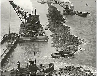 À partir de ces points de construction, la digue fut érigée progressivement par les bateaux apportant le till dans la mer en deux lignes parallèles. Du sable fut dès lors apporté entre ces deux digues, et fut recouvert d'une autre couche de till quand l'ouvrage commença à émerger. Il fut alors renforcé par des blocs de basalte et des pieux de saule enfoncés à la base. La digue put dès lors être terminée en ajoutant d'autres couches de sable et d'argile, pour être finalement recouverte de végétation.