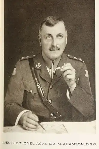 Au début de la Première Guerre mondiale, Agar Adamson se rendit immédiatement à Ottawa et se porta volontaire pour le service. Il utilisa ses contacts pour obtenir une position de lieutenant-colonel au sein du Princess Patricia's Canadian Light Infantry. Il se rendit en Angleterre avec ce régiment en . Il fut décoré de l'ordre du Service distingué pour un acte de bravoure. Le , il a été nommé commandant de son régiment et promu lieutenant-colonel. Sous son commandement, le régiment se distingua lors de leur participation aux batailles de la crête de Vimy et de Passchendaele[2]. Ce qui valu au régiment de recevoirs des compliments de la part de sir Arthur William Currie, le commandant du Corps d'armée canadien[3].