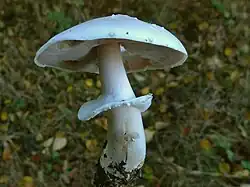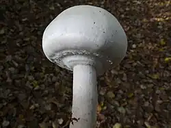 - Pied 6 à 10-12 cm, élancé, blanc-gris, portant un bulbe à la base et un anneau fragile, pendant, blanc-jaune.