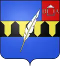 D'azur, à la fasce vairée de sable et d'or, à une plume d'or, barbée d'argent, posée en barre, le bec à dextre brochant sur le tout ; au canton des Barons Officiers de la Maison de l'Empereur brochant.[5] |