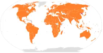 Parmi les États non membres figurent le Soudan du Sud, le Suriname, l'Andorre, Sao Tomé-et-Principe, la Guinée équatoriale, la Guinée-Bissau, les Tuvalu, la Micronésie, les Îles Salomon, les Maldives, le Timor oriental, les Kiribati, Nauru et le Bhoutan.
