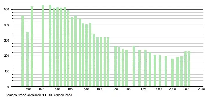 L'évolution du nombre d'habitants est connue à travers les recensements de la population effectués dans la commune depuis 1793. Pour les communes de moins de 10 000 habitants, une enquête de recensement portant sur toute la population est réalisée tous les cinq ans, les populations de référence des années intermédiaires étant quant à elles estimées par interpolation ou extrapolation[26]. Pour la commune, le premier recensement exhaustif entrant dans le cadre du nouveau dispositif a été réalisé en 2007[27].