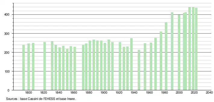 L'évolution du nombre d'habitants est connue à travers les recensements de la population effectués dans la commune depuis 1793. Pour les communes de moins de 10 000 habitants, une enquête de recensement portant sur toute la population est réalisée tous les cinq ans, les populations de référence des années intermédiaires étant quant à elles estimées par interpolation ou extrapolation[19]. Pour la commune, le premier recensement exhaustif entrant dans le cadre du nouveau dispositif a été réalisé en 2008[20].