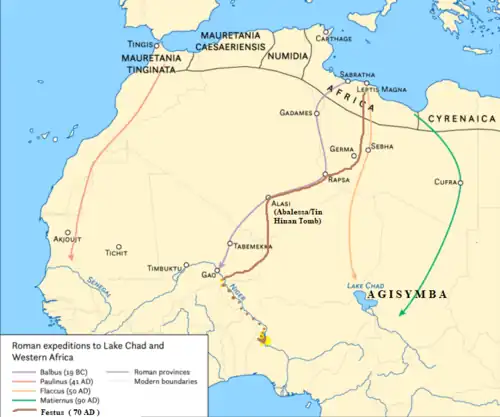 En effet, Ptolémée écrit que vers 90 après J.-C., Julius Maternus (ou Matiernus) entreprend une expédition principalement commerciale. Du golfe de Syrte, il atteint les oasis de Koufra et d'Archei, puis, après quatre mois de voyage avec le roi des Garamantes, il arrive aux rivières Bahr Salamat et Bahr Aouk, dans l'actuel Tchad, dans une région alors appelée Agisymba. Il retourne à Rome avec un rhinocéros à deux cornes qui est exposé au Colisée[3].